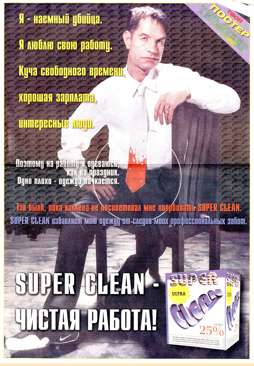 К традиционной части производства журнала - статьям, фоторепортажам и иллюстрациям – сходу добавились «наши» фишки, вроде плакатиков-пародий на рекламу. Из-за этих абсурдных плакатиков, рекламирующих то фейковый стиральный порошок с «отзывом» профессионального киллера («работа интересная, но одежда пачкается»), то предупреждающих: «Не буди во мне зайца!») реальный отдел рекламы к «Тинейджеру» относился с легким опасением, ожидая подвоха и жалоб шокированных потребителей.
